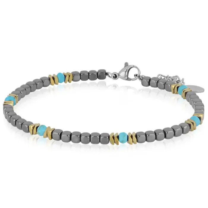 Le pietre che compongono Bracciale uomo turchese Aylen irradiano di energia vitale il suo possessore rendendolo potente ed energico. Il bracciale è dedicato agli spiriti forti, a chi sa guardare avanti con determinazione e audacia.acciaio anallergico e ematite