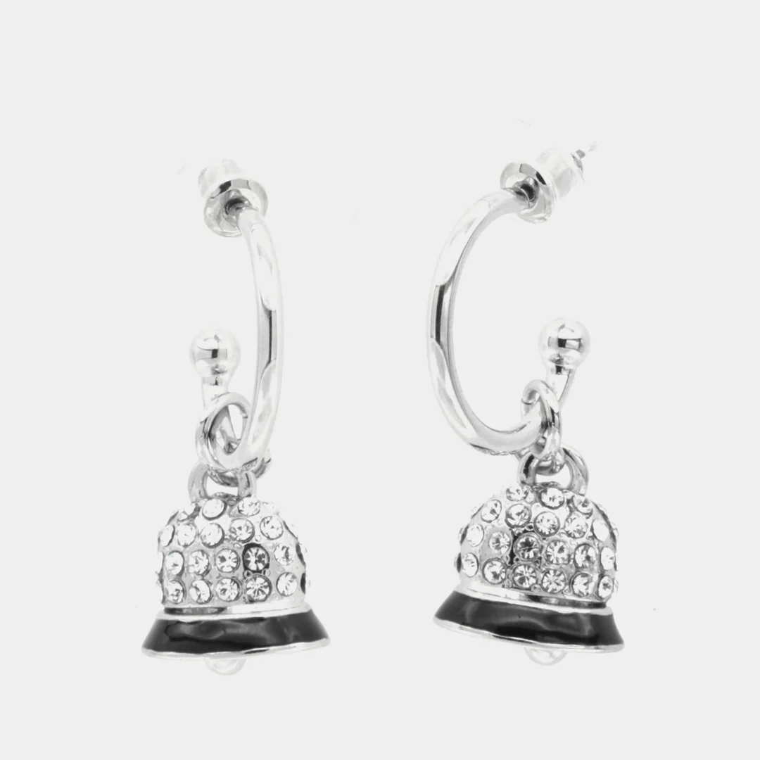 Orecchini in Metallo a cerchietto con campanelle pendenti con cristalli bianchi e linee nere – PLACCATO RODIO